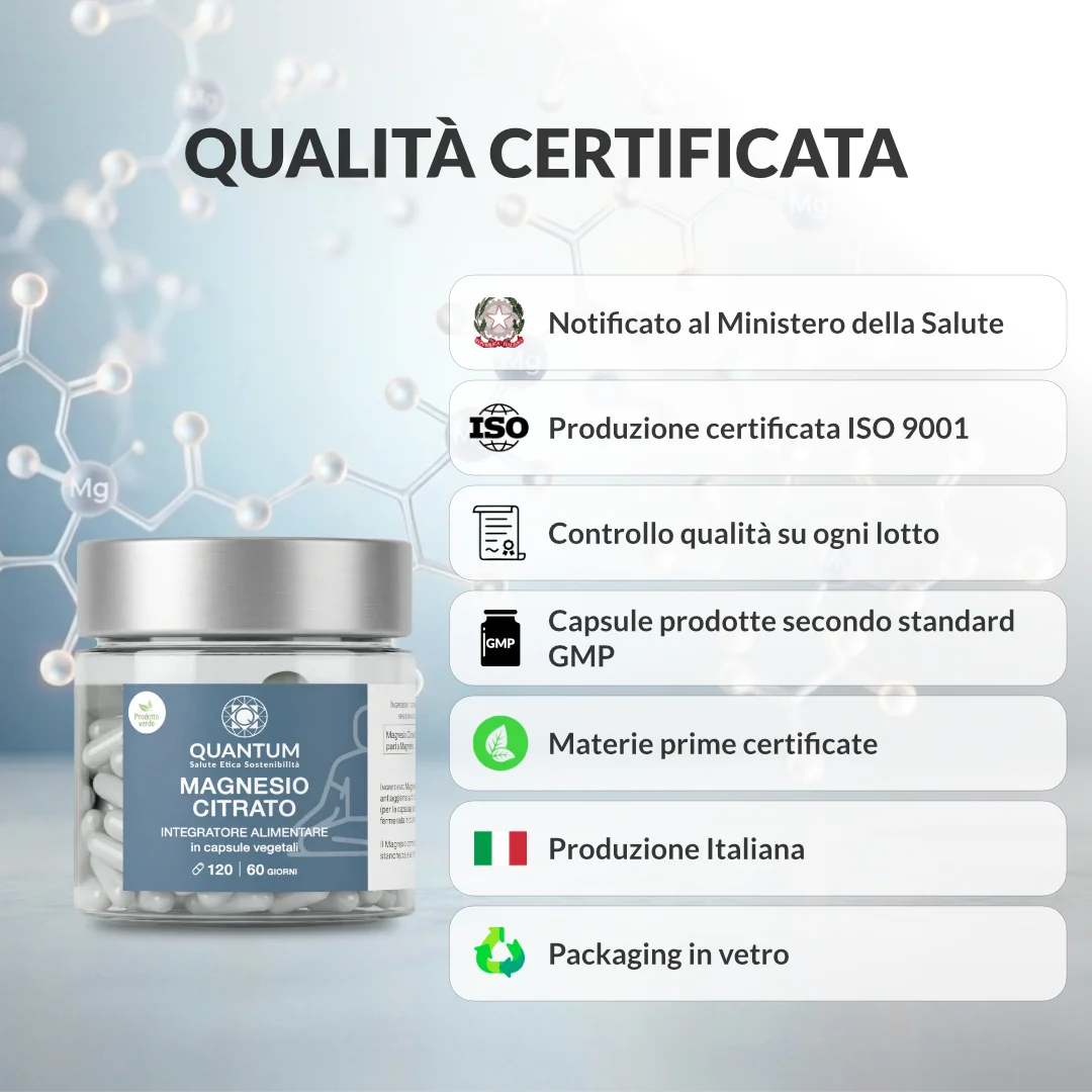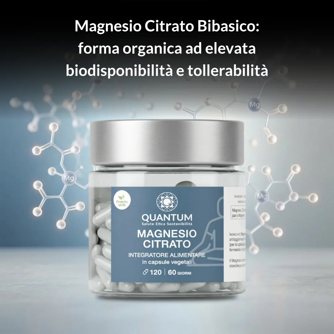 Il Magnesio Citrato Quantum utilizza una forma organica altamente biodisponibile, progettata per favorire un assorbimento efficace e una buona tollerabilità gastrointestinale.